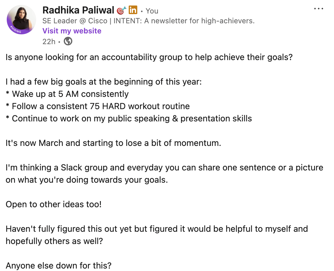 I shared an idea on LinkedIn yesterday about starting a small accountability group to help each other take consistent steps toward our goals and the response has been incredible!